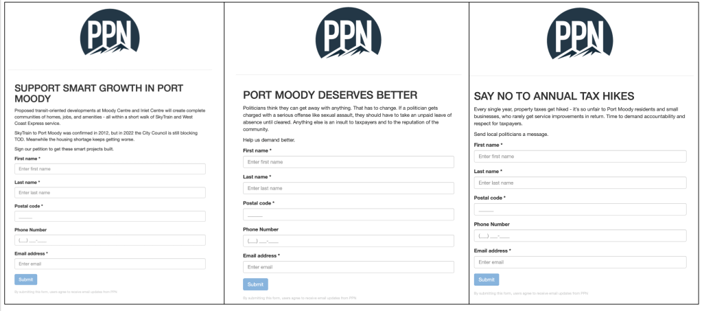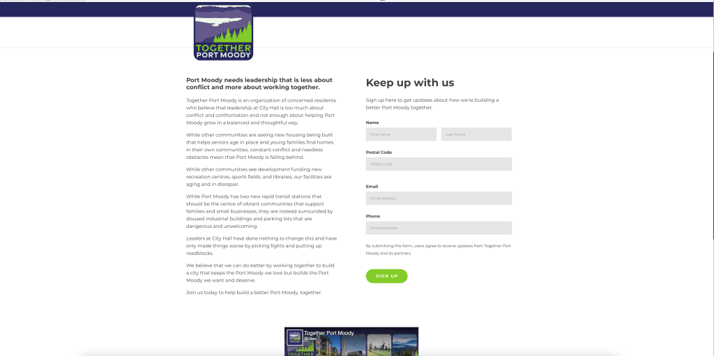 that allowed visitors to voluntarily provide their contact information (name, postal code, email, phone number, etc.) to get updates “about how we’re building a better Port Moody together”. The campaign allegedly represented “an organization of concerned citizens”, a deliberately vague statement I would argue. The Campaign itself consisted of largely rather mundane motherhood statements, broad catchphrases, and empty platitudes that almost everyone could get behind, such as “Let’s work together to improve and expand transportation options” and “Less conflict and more housing options”, etc. These calls to action were inter-mixed with some not so thinly veiled criticisms of the council and how it functioned, i.e., “Port Moody needs leadership” and that Port Moody… “needs leaders who can work together…not put up roadblocks.”, etc.