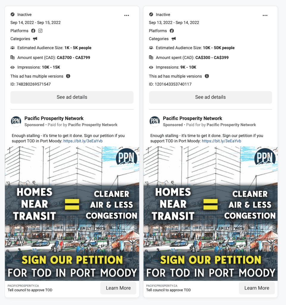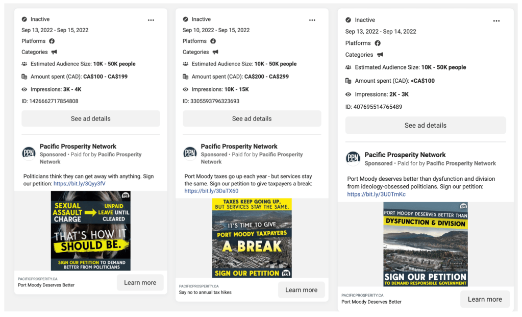 In September, 2022 just before the Pre-Campaign Period ended, Chip Wilson’s Pacific Prosperity Network (PPN) thought that the Port Moody Civic Election, the Moody Centre TOD, and attacking the majority of the prior council was important enough to initiate a modest Facebook Ad campaign with accompanying petitions linked from the ads. Here’s a backgrounder on exactly who the PPN are and what they do. Curiously, the PPN ad campaign only ran for five days (from Sep. 10, 2022 to Sep. 15, 2022) just prior to the end of the pre-campaign period and cost approximately $1,800 (at top end estimates). While this may not seem like a lot of money, this amount represents approximately 6% of the entire advertising budget of $30,621 spent by the PPN on all Facebook ad campaigns (Civic, Provincial, Federal and otherwise) from June 30, 2022 to Dec. 30, 2022. Interesting to note too that according to Facebook Meta Ads Library, that the Port Moody Election was the only municipal election subject to an ad campaign launched by the PPN. Not Vancouver, Squamish, Surrey, or any of the other more contested and more controversial elections. Why would that be? And where did the messaging come from that was utilized in the ads? Did the PPN come up with it independently or was there a local source of that messaging with the messaging in turn being supplied to the PPN?