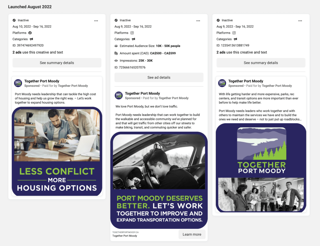 The active Together Port Moody ad campaign ceased (as many predicted) as soon as campaign finance laws required disclosure of who was paying for the ads (the ads stopped immediately prior to the Campaign Period on September 17, 2022). The Facebook ad totals available on in the Meta Ads Library suggest that the Facebook ad campaign totalled approximately $6,000 (top end estimates) while it is unclear what the Google Ad Campaign would have cost as that is not as easy to identify (the Together Port Moody Page was a suggested page during the Pre-Campaign Period in Google, and likely represented a georeferenced and targeted Google ad). The Together Port Moody webpage continued to exist throughout the Campaign Period so while the paid advertising stopped, one could argue that by the website still existing throughout the Campaign period, that the ad campaign never actually stopped.