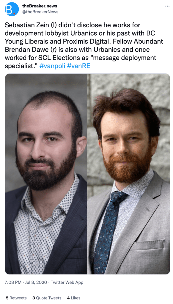 Mr. Zein is well-known in centre right circles for his involvement with the BC Liberals (now BC United) and in centre right City of Vancouver politics with the NPA, Hector Bremner and Yes Vancouver. According to the Breaker News’s Bob Mackin, Zein has also been involved behind the scenes in AstroTurf pro-development campaigns in the past.