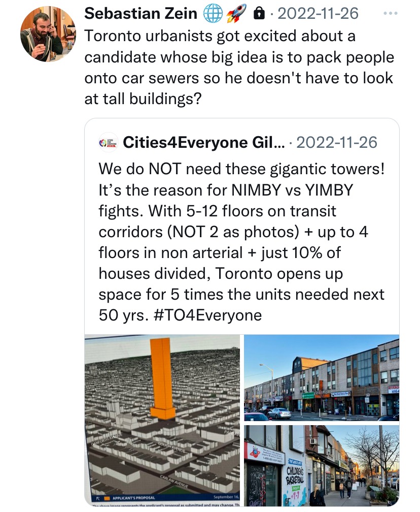 Zein was/is also a member of Abundant Housing Vancouver, a Yes in My Backyard (YIMBY) pro-density and development group and is well-known as an advocate for dense development particularly near transit hubs. His views on municipal politics can be found here (definitely worth a listen). For those interested, Zein’s views on urban development can be found here released as part of an FOI to Vancouver City Council and within his Twitter feed. Let’s just say that advocating for moderate development doesn’t seem to be Zein’s preference and his choice of discourse concerning his perceived political opponents can be at times be rather coarse (see examples below).