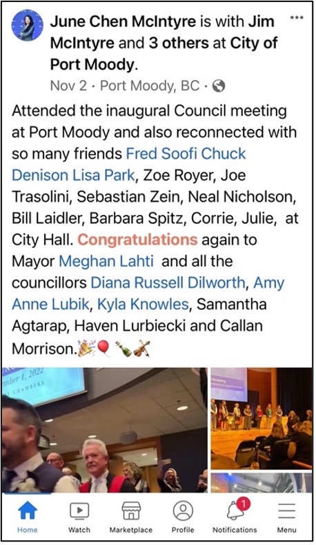 Mr. Zein was also tagged as being present at the swearing in of the new Port Moody Council and Mayor according to a Facebook Post by Jim McIntyre’s wife. Jim being the Manager development planning interim at the City of Port Moody and the Former General Manager, Planning and Development at City of Coquitlam – Municipality, a municipality well known as being developer-friendly under Mayor Richard Stewart.