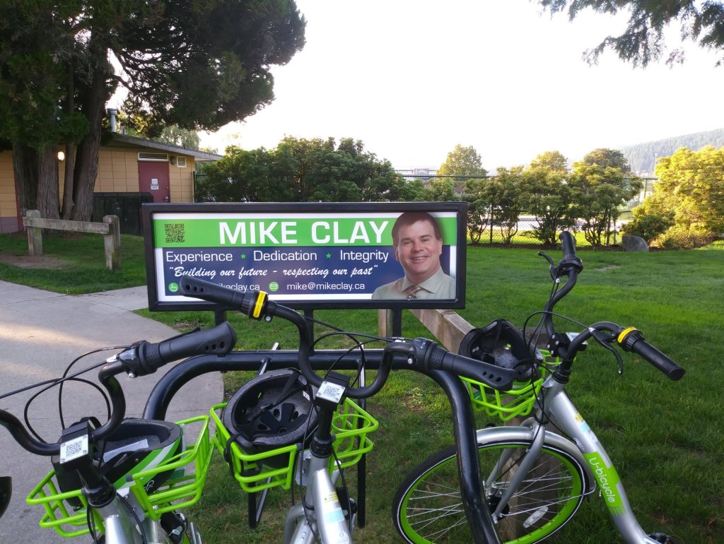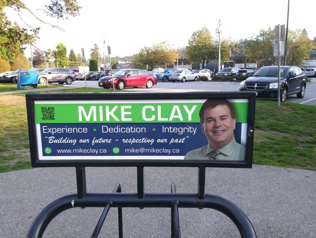 The fuss over the advertisement will be familiar to those long term residents and long-time political observers of Port Moody Elections at the civic and other levels as it is somewhat reminiscent of a controversy that erupted during the 2018 Election Civic Election over a different type of commercial advertisement on public property (bike racks in this case) paid for by then Mayor Mike Clay just prior to the election in 2018 (see below).
