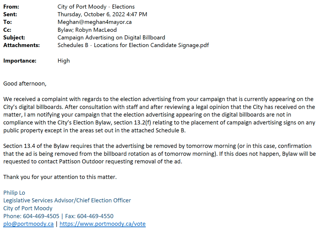 Notification from the Senior Bylaw Enforcement Officer City of Port Moody to Pattison Outdoor requesting that the digital campaign ad should be removed and/or no longer displayed as the ad is in contravention of the City’s General Local Government Election Bylaw No. 3367 section 13.2(f).