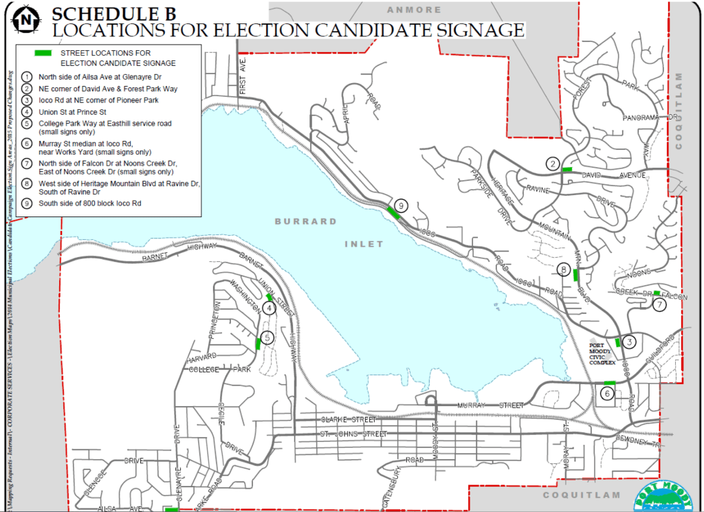 As noted previously, election signage within the City of of Port Moody is governed by the City of Port Moody’s General Local Government Election Bylaw, 2011, Bylaw 3367. The bylaw identifies the maximum size of advertisements, required content, their acceptable locations on public property (see Map below identified as Schedule B in the bylaw), etc. Elections B.C. does not regulate election signs locations within municipalities. That is left up to the individual municipalities.
